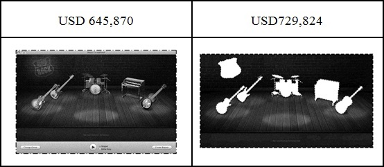 有些GUI雖呈現出立體展示空間或是立體舞台實境的視覺效果(如圖3所示),但本質上還是平面圖形,且展示空間及舞台中沒有預留可供變化的留白區域或以虛線表示的不主張設計之部分,使得GUI中無法添加人物、文字或其他圖形。通常,在GUI中如有不主張設計之部分,文字、數字或圖形則應以虛線的形式呈現之(如圖4所示),如果GUI的圖形中有不主張設計之部分、或有可變化之部分,則應挖空留白且以虛線框圍繞(如圖4及圖5右側所示)。