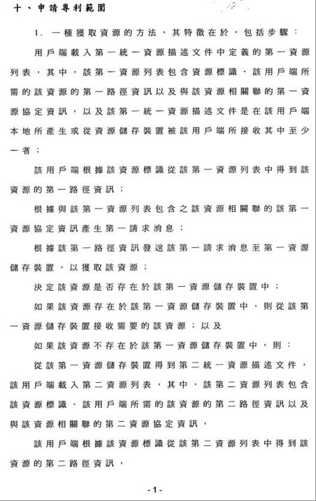 果不其然,該請求項1花了相當大的篇幅來描述所謂第二資源描述文件(後備資源的列表,另一Cookie)的運用,已經大幅限制了該專利的請求範圍。
