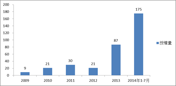 大陸現今屬於外觀設計專利的審查團隊共182人,平均審查周期為4.5個月,採取的是區分領域的審查方式。隨著大陸知識產權局審查能力不斷提升,累計到2013年,有效的外觀設計專利達到122萬件。從近年來大陸外觀設計的授權量可發現,2009~2012年的授權量呈現逐年趨緩的成長趨勢,直到2013年開始出現負成長11.7%,今年1~7月外觀設計授權量為19萬6,940件,比去年同期減少16%。