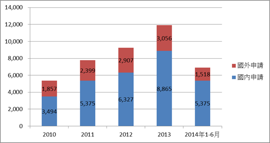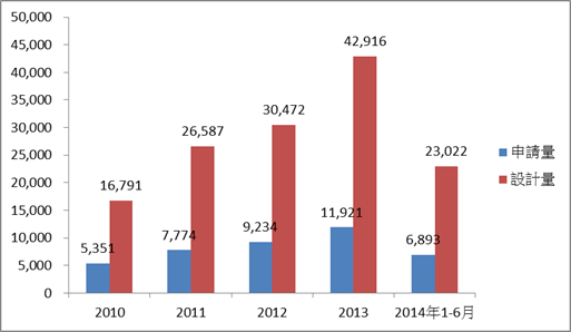 相似外觀設計的部分,同樣也是國內申請人比較多,2014年1~6月的申請案中,有5,375件來自本地,其他國家申請案為1,518件。
