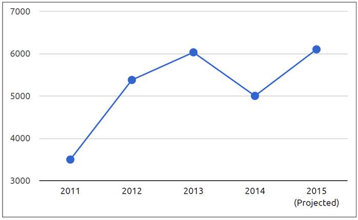 Unified Patents 今年8月發布的「2015年上半年美國專利糾紛報告」顯示,美國2015年第1、2季專利訴訟案量分別為1,451件及1,599件(即上半年共有3,050件專利訴訟案件);而訴願案件則分別為440及513件(即上半年共953件專利訴願案件)(圖2)。藉由上半年的數據,Unified Patents也預估了2015年專利訴訟及訴願案件的案量,分別為6,100件及1,906件(圖3)。