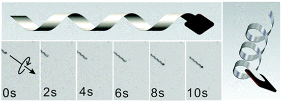 科學家現在也開始以人工方式模擬細菌的推進行為,目標是創造出完全人工製造的「奈米泳者」(nanoswimmers)。圖七為蘇黎世聯邦理工學院(ETH Zurich)與猶他大學及密西根州大聯合設計的人造細菌鞭毛(artificial bacterial flagella;ABF),其構造為鉻鎳金薄膜堆疊而成的磁性頭部,以及模擬細菌鞭毛的螺旋狀尾部,利用低強度的旋轉磁場就可帶動ABF,若調整磁場的旋轉速度及方向,就可以有效的控制ABF游動的速度與方向。