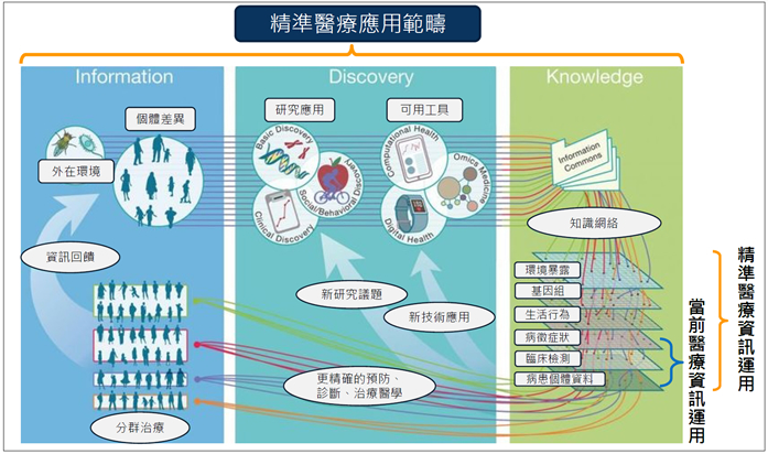 精准医疗之所以能达成,有很大部分是靠资料搜集及解读,这些数据最主要是基因数据及个体差异(如生活、饮食习性等)。如图1所示,当数据搜集到需求的量的时候,即可进行分群(治疗),再针对不同分群作数据分析及研究,然后将分析所得资料归纳整理成系统化之有用信息(图1右边之区块),这些信息即可作为精准用药之参考依据。