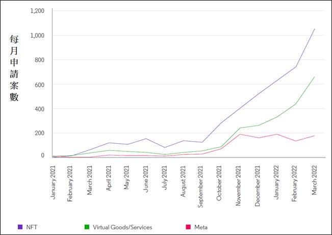 图4. 2021年1月至2022年2月,用于「虚拟商品/服务」、「NFT」领域,及包含「Meta」一词的美国商标注册申请数