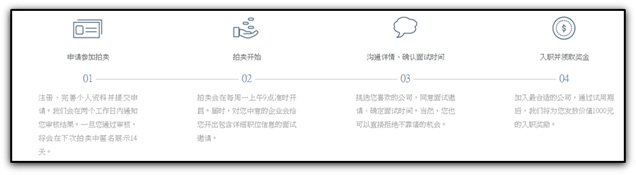 以成立于2014年5月的大陆人才拍卖网站「100offer」为例,想求职的程序员首先必须先提交简历,通过100offer内部筛选后,符合条件者才可以参加一周一次的集中拍卖。招聘企业可以浏览这些被拍卖程序员的简历,如果对某位程序员感到兴趣,就可以发出面试邀约。但是否 接受面试邀约,决定权还是回到程序员手中。