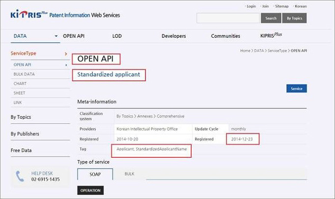 KIPO局长金永民(Kim Youngmin)日前宣布,已经完成了【「韩文-英文」专利申请人姓名统一化】数据库的建构,而这在全球专利局中算是创举。自2014年12月23日起,民众可以透过KIPO的专利信息网上服务 (KIPRISPlus)来免费取得相关信息。信息分别以Open API及Bulk Data两种形式提供。
