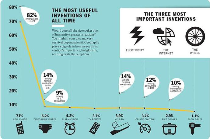 这份调查结果显示,有超过71%的受访者一致认为移动电话是最有用的发明;出乎意料之外的是,排名第二的居然是纸尿布,占5.2%的受访者认为是最有用的发明,结果很超乎想象吧?