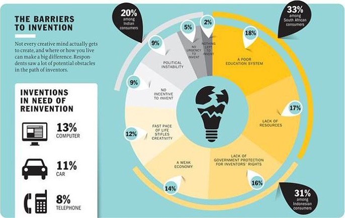 前文就提到,政府在提升、推广发明的意识上,占很重要的地位,除了正面鼓励及推动外,排除负面的障碍也是责无旁贷。图2是受访者认为属于发明障碍的因素,其中「差劲的教育系统」、「缺乏资源」及「政府对智财保护不足」为3大首要障碍。就政府对知识产权保护的部分,可以说是一种恶性循环:政府对知识产权保护不足,人们也不想特别去保护知识产权,也不会花心力在研发上,因为研发的心血一下子就会被盗用。