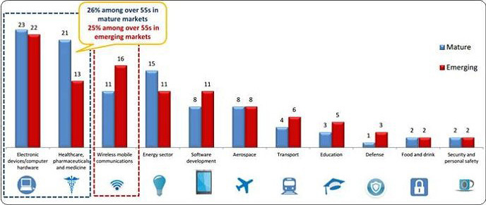 图4显示了未来最具发明潜力的领域,有45%的受访者(23%来自已开发国家、22%来自开发中国家)认为电子产品及计算机硬件是未来最具开发潜力的领域,此一趋势与过去是延续的,至于排名第2的医疗保健及药品领域则是值得好好注意,在选择这个领域的34%的受访者中,有约25%是年龄55岁以上的受访者,再一次印证了「需求为发明之母」这句话。
