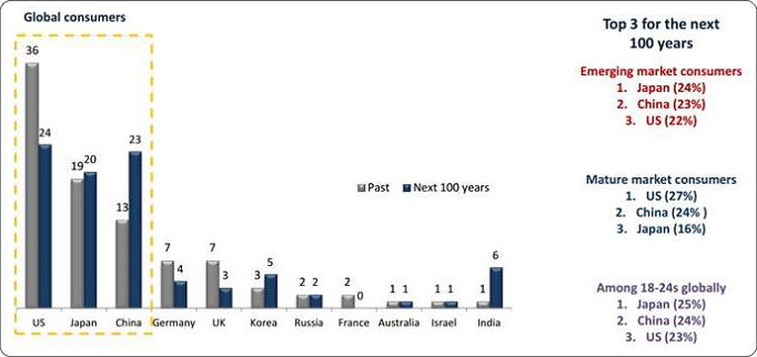 此外,在未来的一百年,大部分人认为中国在「发明」的领域占很重要的地方,甚至超越日本,紧随美国之后,你能想象吗?发明全球化是未来一百年的趋势,你掌握了吗?