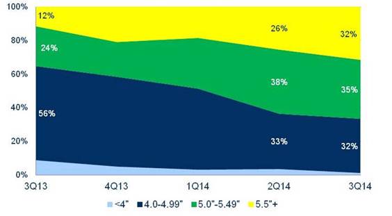 图一、台湾智能手机尺寸出货占比(2013年Q3~2014年Q3)