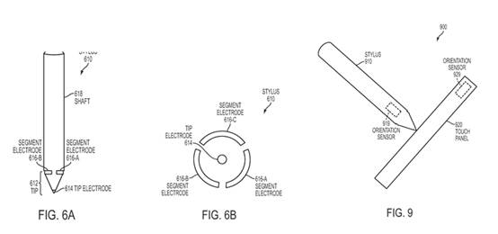 此外,苹果也针对触控笔定位检测申请专利(专利名称Stylusorientation detection,专利编号:US 8,638,320),可透过定位检测来计算触针与接触面的方向。从该专利发现苹果将触控笔模块化,基本模块包括触控笔笔尖,扩充模块衍生出来的功能十分多元,包括一个或多个电源、相机、音频记录器、通信电路、陀螺仪、加速计、投影仪等。