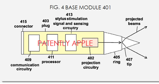 苹果指出,投影可以用来显示在表面上的图像,并允许用户透过移动触笔横跨投影图像来编辑文文件。投影仪可以包括在基本模块内,或是放置于扩充模块中。突起电路包括一台投影机或其他合适的成像装置,以弥补由投影电路而引起的投影表面失真。