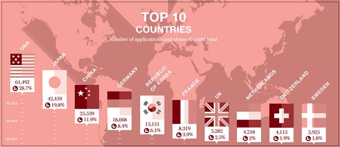 从图1可见,美国仍是PCT国际专利申请最多的国家,2014年申请量为61,492件,同比增长7.1%,占全球数量的28.7%,其次是日本,申请量为42,459件,同比下降3%,占申请总量的19.8%,而中国则排在第3位。