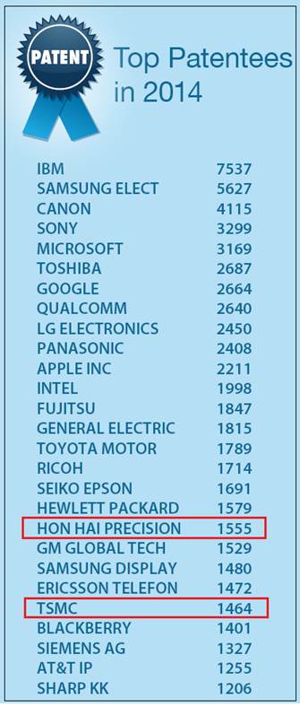 图5是在USPTO官网上秀出的2014年美国专利数量领先的专利权人,USPTO共列出27家,但其中并没有任何一家的中国大陆企业,反观台湾地区企业倒是有2家,分别是鸿海(Hon Hai)及台积电(TSMC),在PCT国际申请中遥遥领先的大陆企业华为与中兴,在美国专利中似乎表现不佳 (于2013年时,华为美国专利获证量为685件,而中兴甚至只有273件),因此大陆企业「走出去」策略看来仍未有具体成效。