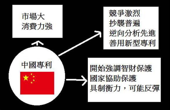 然而,在改革开放的影响下,中国市场的发展已不容忽视,甚至提升到一个很重要的地位。尤其是中国在「十一五」计划中,强调自主知识产权的建立,鼓励中国企业申请专利,成果丰硕;另一方面,中国也已正式超越美国,成为专利第一大国,在在都显示了中国专利的重要性日益加剧,台湾地区的厂商实不容忽视。