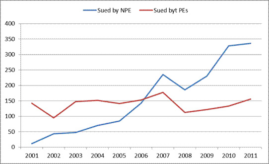 图1:2001~2011美国被NPE/PE提告之企业数量