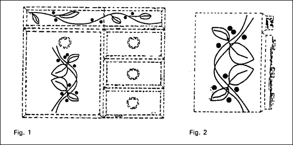 假设图1中的Fig1到Fig6为设计专利图标,Fig1为产品正面图。虽然Fig1详细描述贩卖产品的正面图样,但如果设计特征并无强调每层有「O」的装饰,则无需在图标表达,因为详细特征的描绘将使专利范围限缩。因此,如果将Fig1上「O」的装饰图像去除,则可扩大实际产品保护范围,且保护范围也会比Fig1为大。此时,只要产品具有上层具有一朵Fig1所描述的花、正面左边有花的图样及三层抽屉,就构成侵权,而无须每层抽屉具有「O」的装饰。