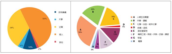 图5. 2000-2014越南发明专利及新型专利领证件数统计,图左:以专利权人身份分类;图右:以IPC分类