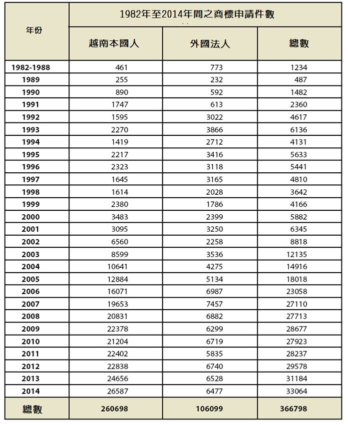 在2014年,越南专利局共接获了83,436件跟知识产权相关的申请案,与2013年相比成长了8.8%,其中专利及商标的申请案共46,345件,与2013年相比成长了7.8%。这4万多件案件包括了4,447件发明专利申请、373件新型专利、2,311件设计专利、33,064件国家商标、6,025件国际商标 (透过马德里国际注册)、2件地理标示、19件集成电路保护及106件以越南为第一国申请的国际案件 (5件PCT专利,101件商标经马德里国际注册)(图 3、图4、图6)。