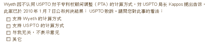 美国联邦巡回上诉法院(Federal Circuit, Fed. Cir.)于2010年1月7日公布Wyeth v. Kappos案判决结果:USPTO专利权期间调整(Patent Term Adjustment, PTA)法规诠释、计算方式皆有违35 USC 154(b)的规定,故判USPTO败诉。获悉诉讼结果后,USPTO于1月11日表示将重新修正PTA计算方式,并于1月21日宣布USPTO和美国司法部将不再针对本案上诉。