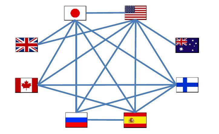 图一:PPH MOTTAINAI 试点计划中,日本、美国、英国、加拿大、澳洲、芬兰、俄罗斯和西班牙8国专利局的具体PPH双边协议情况