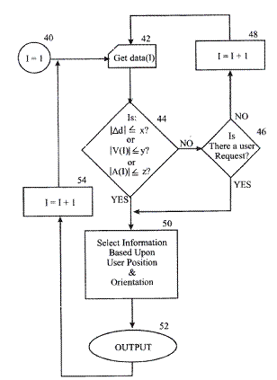 步骤40为起点,counter设置为1。接着,步骤42包括获取data(I),如:使用者位置、速度、加速、定向定位和/或时间之data (I)。步骤44用于评估 data(I),以确定是否该使用者位置有发生小于默认值的变化(Ad),以证实该使用者的移动已大致停顿。查询步骤44,另也可以评估其它数值的变化,例如速度、加速度等。如果步骤44之答案是no,接下来查询步骤46将评估是否取得使用者的手动数据要求?如果没有,counter为递增1及数据获取步骤42将被重复。如果查询步骤44或46的答案是yes,则进行流程步骤50,根据使用者的位置和方向定位于时间(I),自一多媒体存储系统选定一分级多媒体讯息。最后,步骤50选定的分级多媒体讯息将被输出于52步骤。另外,counter即被递增1 (步骤54),以及输入步骤42将被重复。