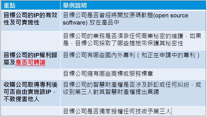 圖1. 收購公司對於目標公司的智慧財產權盡職查核之重點