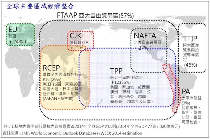 TPP之所以重要,是因為它是第一個連結亞太地區的區域貿易協定,根據經濟部的資料顯示,其經濟規模可28兆美元,約占全球生產總值的36%,高於歐盟 (European Union,EU)的24%及北美自由貿易區 (North American Free Trade Area,NAFTA)的27%之比重,是亞太地區最大之區域經濟整合體。(請參考圖2)