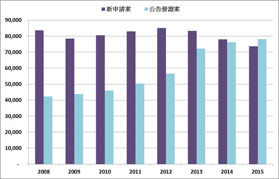 圖1:2008~2015台灣專利新申請案與發證案數量變化
