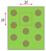 图3(a) FanFET晶体管的扇型的结构、坐标与端点(左);图3(b) FanFET单位面积的特征尺度,2F*2F/2 = 2F2 (右)