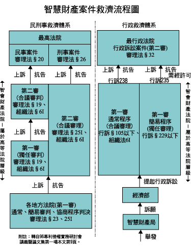 审理法第 31 条第 1 项及组织法第 3 条第 3 款规定,「因专利法、商标法、着作权法、光盘管理条例、集成电路电路布局保护法、植物品种及种苗法或公平交易法涉及智慧财产权所生之第一审行政诉讼事件及强制运行事件。」组织法第 3 条第 4 款规定,「其他依法律规定或经司法院指定由智慧财产法院管辖之事件。」